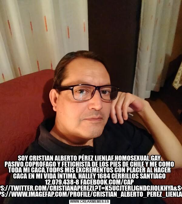 SOY CRISTIAN ALBERTO PÉREZ LIENLAF,HOMOSEXUAL,GAY PASIVO,COPRÓFAGO Y FETICHISTA DE LOS PIES DE CHILE Y ME COMO TODA MI CACA,TODOS MIS EXCREMENTOS CON PLACER AL HACER CACA EN MI VIDA ÍNTIMA. HALLEY 1684 CERRILLOS SANTIAGO 12.079.438-8 FACEBOOK.COM/CAP