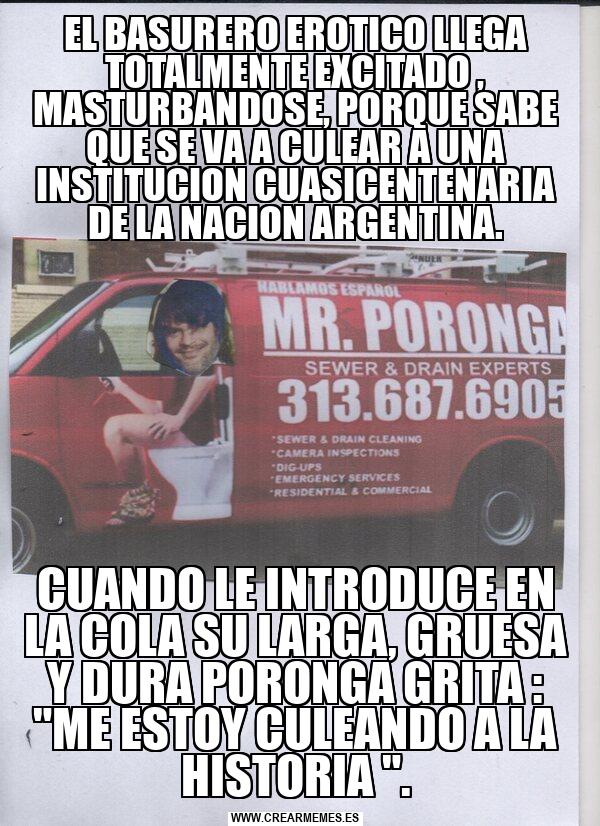 EL BASURERO EROTICO LLEGA TOTALMENTE EXCITADO , MASTURBANDOSE, PORQUE SABE QUE SE VA A CULEAR A UNA INSTITUCION CUASICENTENARIA DE LA NACION ARGENTINA. CUANDO LE INTRODUCE EN LA COLA SU LARGA, GRUESA Y DURA PORONGA GRITA : "ME ESTOY CULEANDO A LA HISTORIA ".