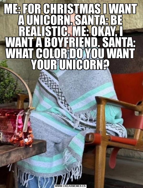 ME: FOR CHRISTMAS I WANT A UNICORN. SANTA: BE REALISTIC. ME: OKAY, I WANT A BOYFRIEND. SANTA: WHAT COLOR DO YOU WANT YOUR UNICORN?