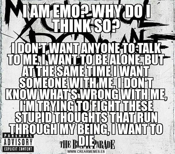 I AM EMO? WHY DO I THINK SO? I DON'T WANT ANYONE TO TALK TO ME, I WANT TO BE ALONE, BUT AT THE SAME TIME I WANT SOMEONE WITH ME, I DON'T KNOW WHAT'S WRONG WITH ME, I'M TRYING TO FIGHT THESE STUPID THOUGHTS THAT RUN THROUGH MY BEING, I WANT TO DIE