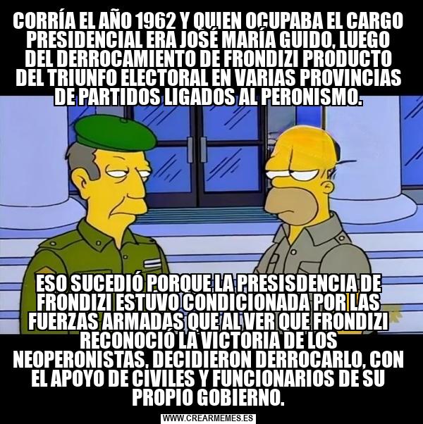 CORRÍA EL AÑO 1962 Y QUIEN OCUPABA EL CARGO PRESIDENCIAL ERA JOSÉ MARÍA GUIDO, LUEGO DEL DERROCAMIENTO DE FRONDIZI PRODUCTO DEL TRIUNFO ELECTORAL EN VARIAS PROVINCIAS DE PARTIDOS LIGADOS AL PERONISMO. ESO SUCEDIÓ PORQUE LA PRESISDENCIA DE FRONDIZI ESTUVO CONDICIONADA POR LAS FUERZAS ARMADAS QUE AL VER QUE FRONDIZI RECONOCIÓ LA VICTORIA DE LOS NEOPERONISTAS, DECIDIERON DERROCARLO, CON EL APOYO DE CIVILES Y FUNCIONARIOS DE SU PROPIO GOBIERNO.