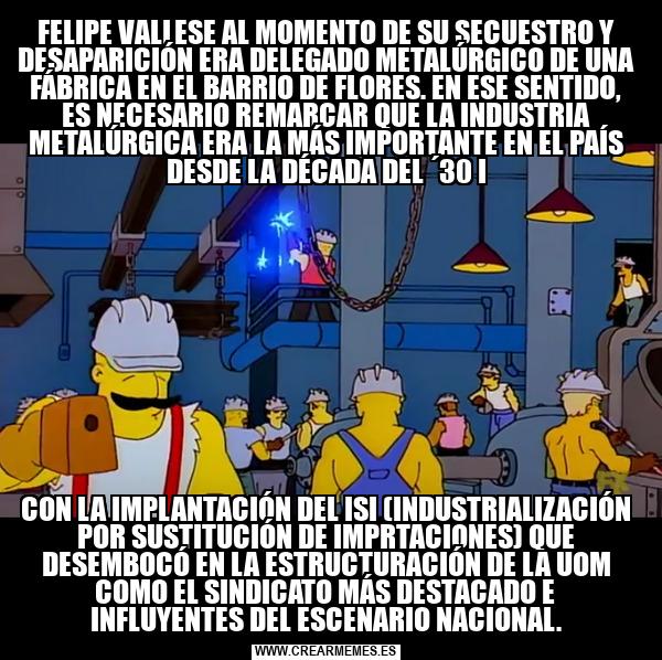 FELIPE VALLESE AL MOMENTO DE SU SECUESTRO Y DESAPARICIÓN ERA DELEGADO METALÚRGICO DE UNA FÁBRICA EN EL BARRIO DE FLORES. EN ESE SENTIDO, ES NECESARIO REMARCAR QUE LA INDUSTRIA METALÚRGICA ERA LA MÁS IMPORTANTE EN EL PAÍS DESDE LA DÉCADA DEL ´30 I CON LA IMPLANTACIÓN DEL ISI (INDUSTRIALIZACIÓN POR SUSTITUCIÓN DE IMPRTACIONES) QUE DESEMBOCÓ EN LA ESTRUCTURACIÓN DE LA UOM COMO EL SINDICATO MÁS DESTACADO E INFLUYENTES DEL ESCENARIO NACIONAL.