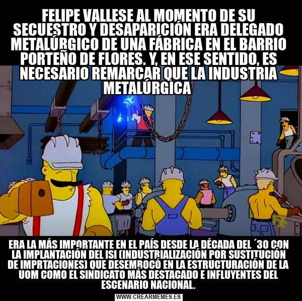 FELIPE VALLESE AL MOMENTO DE SU SECUESTRO Y DESAPARICIÓN ERA DELEGADO METALÚRGICO DE UNA FÁBRICA EN EL BARRIO PORTEÑO DE FLORES. Y, EN ESE SENTIDO, ES NECESARIO REMARCAR QUE LA INDUSTRIA METALÚRGICA ERA LA MÁS IMPORTANTE EN EL PAÍS DESDE LA DÉCADA DEL ´30 CON LA IMPLANTACIÓN DEL ISI (INDUSTRIALIZACIÓN POR SUSTITUCIÓN DE IMPRTACIONES) QUE DESEMBOCÓ EN LA ESTRUCTURACIÓN DE LA UOM COMO EL SINDICATO MÁS DESTACADO E INFLUYENTES DEL ESCENARIO NACIONAL
