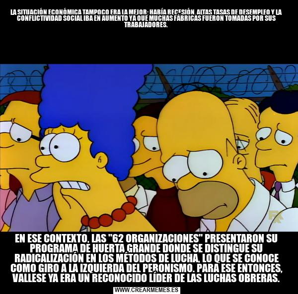 LA SITUACIÓN ECONÓMICA TAMPOCO ERA LA MEJOR: HABÍA RECESIÓN, ALTAS TASAS DE DESEMPLEO Y LA CONFLICTIVIDAD SOCIAL IBA EN AUMENTO YA QUE MUCHAS FÁBRICAS FUERON TOMADAS POR SUS TRABAJADORES. EN ESE CONTEXTO, LAS "62 ORGANIZACIONES" PRESENTARON SU PROGRAMA DE HUERTA GRANDE DONDE SE DISTINGUE SU RADICALIZACIÓN EN LOS MÉTODOS DE LUCHA, LO QUE SE CONOCE COMO GIRO A LA IZQUIERDA DEL PERONISMO. PARA ESE ENTONCES, VALLESE YA ERA UN RE