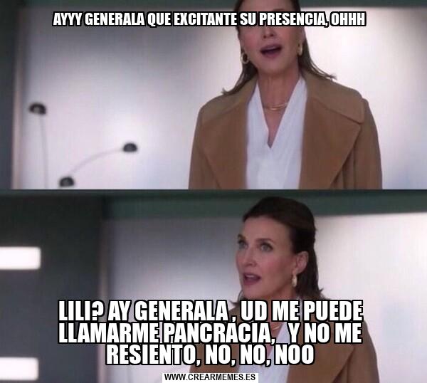 AYYY GENERALA QUE EXCITANTE SU PRESENCIA, OHHH LILI? AY GENERALA , UD ME PUEDE LLAMARME PANCRACIA, Y NO ME RESIENTO, NO, NO, NOO