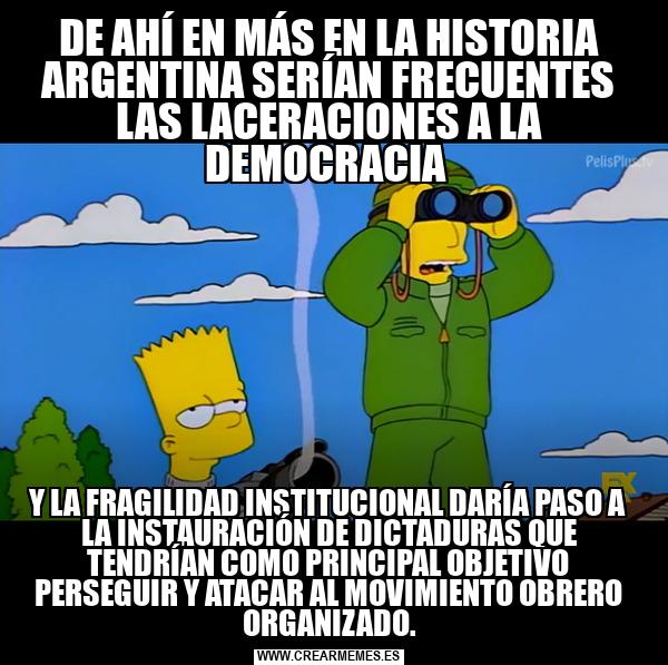 DE AHÍ EN MÁS EN LA HISTORIA ARGENTINA SERÍAN FRECUENTES LAS LACERACIONES A LA DEMOCRACIA Y LA FRAGILIDAD INSTITUCIONAL DARÍA PASO A LA INSTAURACIÓN DE DICTADURAS QUE TENDRÍAN COMO PRINCIPAL OBJETIVO PERSEGUIR Y ATACAR AL MOVIMIENTO OBRERO ORGANIZADO.