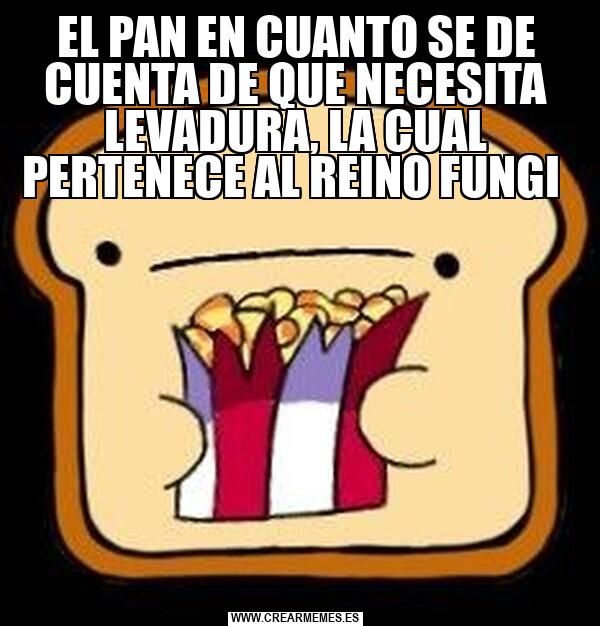 EL PAN EN CUANTO SE DE CUENTA DE QUE NECESITA LEVADURA, LA CUAL PERTENECE AL REINO FUNGI