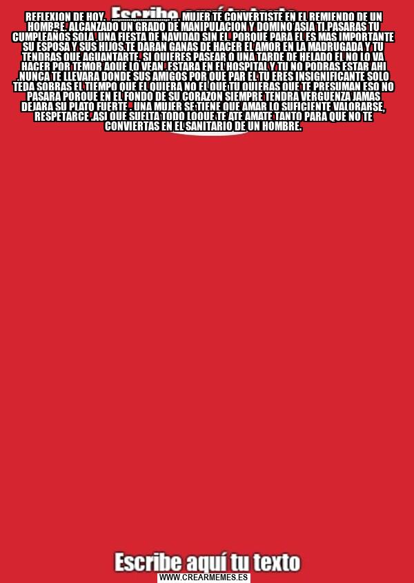 REFLEXION DE HOY. ............................ . MUJER TE CONVERTISTE EN EL REMIENDO DE UN HOMBRE, ALCANZADO UN GRADO DE MANIPULACION Y DOMINO ASIA TI,PASARAS TU CUMPLEAÑOS SOLA ,UNA FIESTA DE NAVIDAD SIN EL, PORQUE PARA EL ES MAS IMPORTANTE SU
